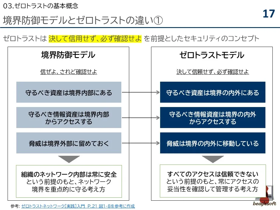 境界防御モデルは、ネットワークを「安全な内側」と「安全ではない外側」に分けて管理します。ゼロトラストは、「どこかしこも安全でない」とします。ここに決定的な違いがあります。