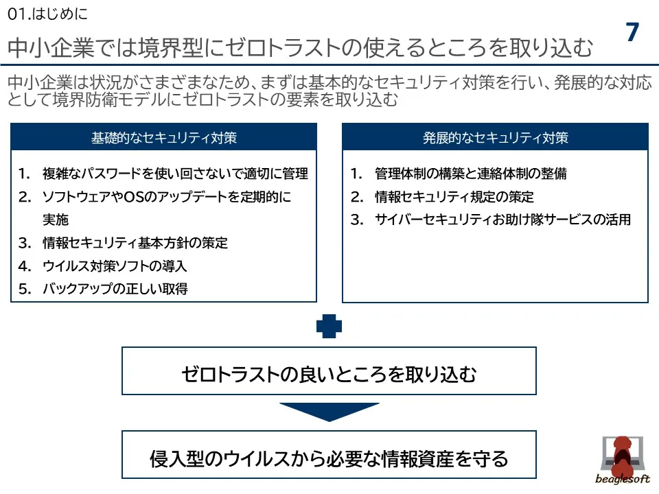 結論としては、境界防衛モデルを中心とした基礎的なセキュリティ対策と発展的なセキュリティ対策を進めつつ、ゼロトラストのエッセンスを取り込むことが望ましいと考えます。