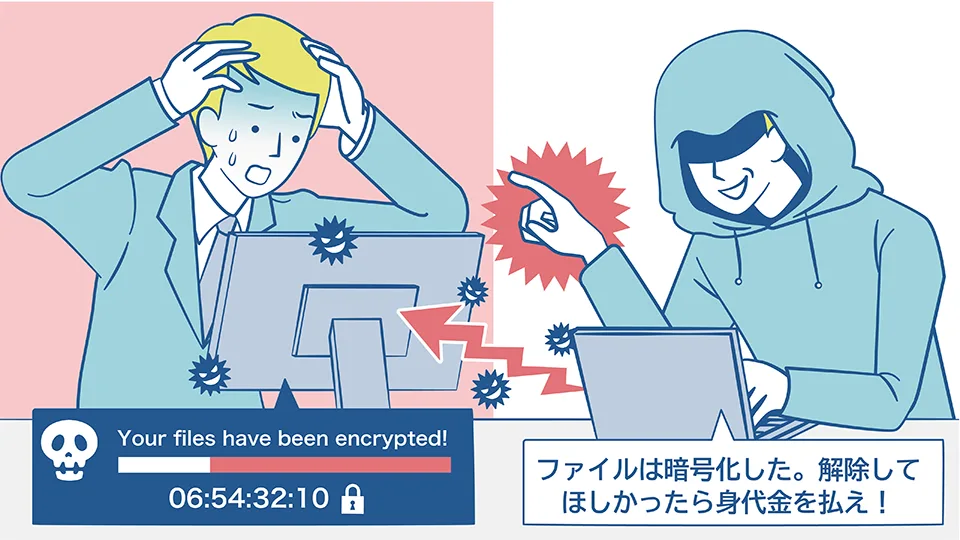 ランサムウェアとは、パソコンやスマートフォンをウイルスに感染させて、保存されているファイル等のデータを勝手に暗号化することで使用できない状態にした後、それを元に戻すことと引き換えに「身代金」を要求する不正プログラムです。(ランサムウェア、あなたの会社も標的に? 被害を防ぐためにやるべきこと | 政府広報オンライン)