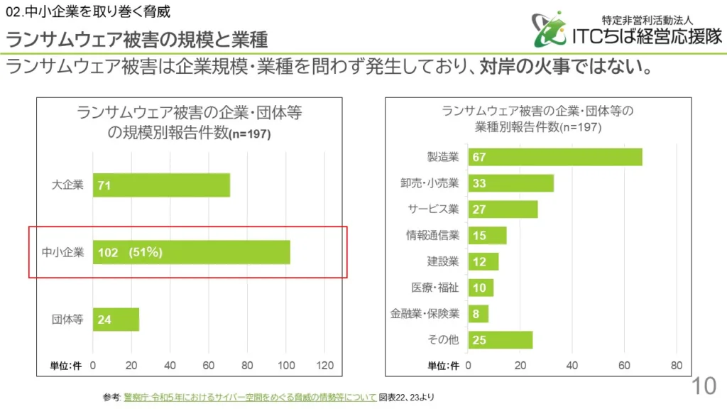 中小企業は規模が小さく情報資産も少ないだろうから、ランサムウェアに感染することはないと考えている方もいるでしょうが、警察庁のまとめでは中小企業の被害件数が全体の50%を超えています。