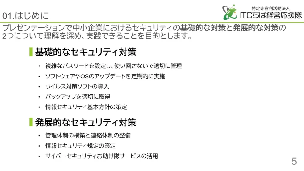 中小企業でセキュリティ対策は、基礎的なセキュリティ対策と発展的なセキュリティ対策の2種類となります。基礎的なセキュリティ対策は、従業員がパソコンの利用を安全に行うための内容で、発展的なセキュリティ対策は、組織として行う対策となります。