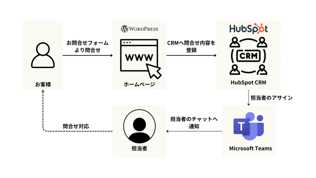 さて、弊社のホームページのお問い合わせフォームを試験的にHubSpotへ変更してみました。全体像としては以下のようになります。