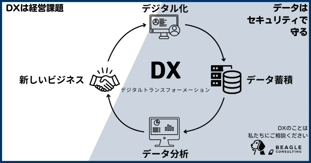 DXといえばITとつながりますが、実はそんなに単純ではありません。デジタル化すればすべてが解決するわけではなく、デジタル化して効果が得られるような仕組み作りが重要なのです。そのためには、業務改善も必要です。持続可能な仕組みとするためにはセキュリティー対策による利便性とのトレードオフも検討する必要があります。