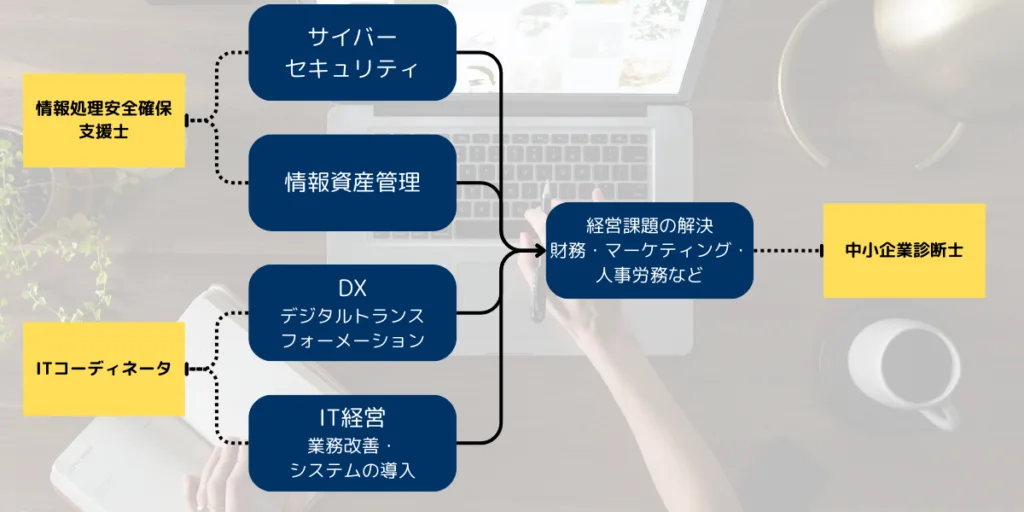 情報処理案沿革干し遠視はサイバーセキュリティ全般や情報資産管理などが主な守備範囲です。ITコーディネータはDXやIT経営が守備範囲です。一方で、中小企業診断士はこれら経営課題を解決することが守備範囲となります。