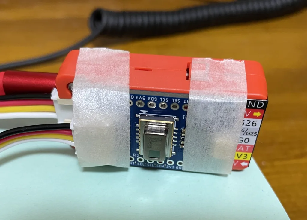 ところで、センサーは本体に取り付けるというよりぶら下がっているだけなのでマスキングテープで背面に貼り付けています。実際にどこかで利用するときにはケースを工夫する必要がありそうです。多分3Dプリンタとか使えるといい感じにできるのでしょうね。
